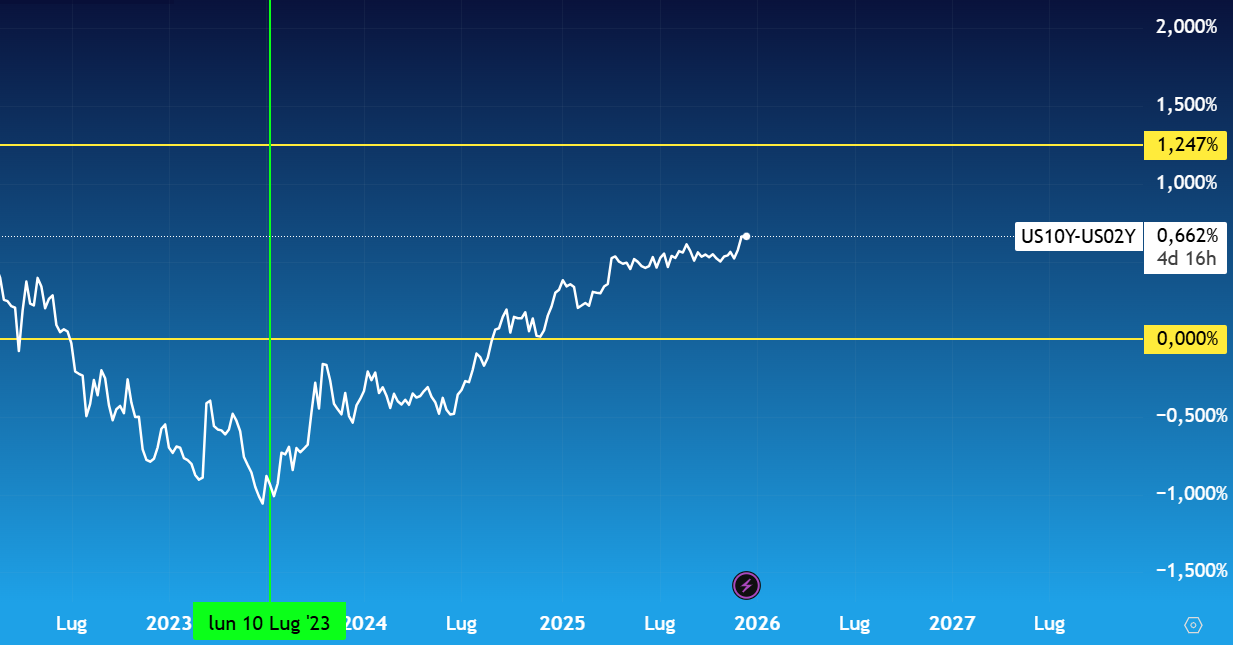 Massimi dal 2022 per lo spread 2-10 anni Usa che si porta a 66 punti base, livelli che mettono in guardia per il prossimo ciclo di taglio dei tassi. Proprio l'aumento dello spread é stato storicamente un forte indicatore di taglio dei tassi, il suo aumento porta sempre al raggiungimento del primo target dei 120 punti base, il che significa probabili tagli dei tassi nel corso dei prossimi mesi al contrario di quanto visto quest'anno con i dazi che hanno rallentato tutto il processo in atto per via dell'inflazione artificialmente portata al rialzo. Occhio quindi alle prossime settimane, lo spread potrebbe ulteriormente salire con i dati occupazionali di questa settimana.