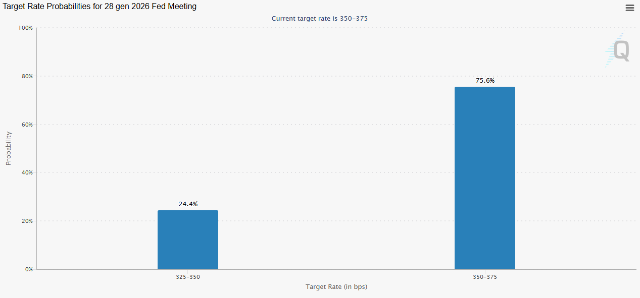 Probabilitá di taglio dei tassi per la prossima riunione Fed del 28 gennaio 2026 - Fonte: Cme - FedWatch Tool