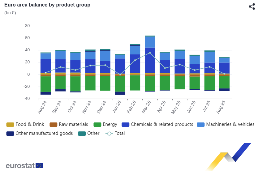 Ad agosto 2025, la bilancia commerciale dell’Eurozona mostra un avanzo destagionalizzato di 6,1 miliardi di euro, con esportazioni verso paesi extra-UE in calo e commercio intra-area in aumento.
