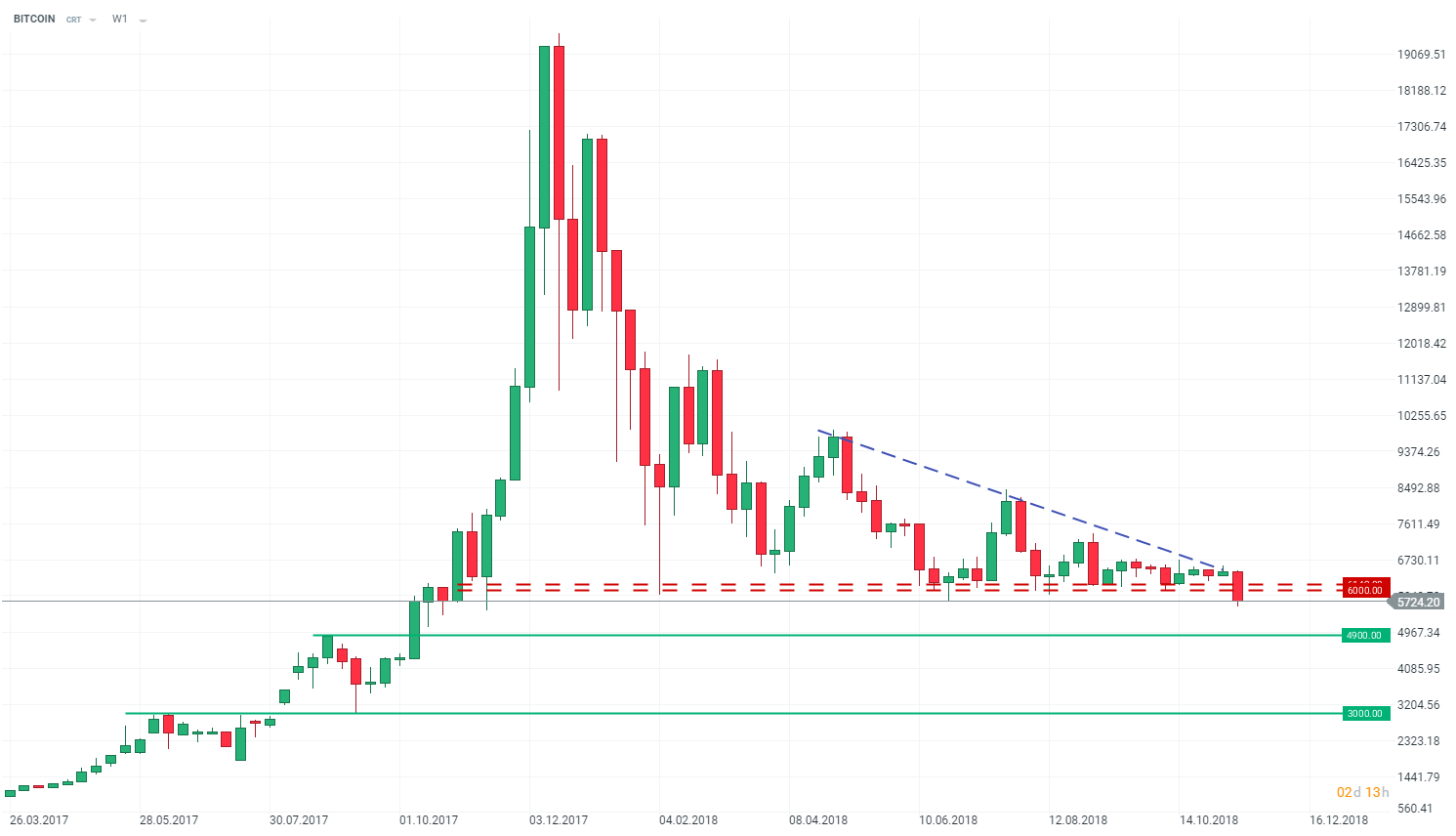 Dando un'occhiata ad un grafico Bitcoin settimanale ci sono pochi motivi di ottimismo. A meno che non ci sia una ripresa dell'ultimo minuto, Bitcoin chiuderà al livello più basso dall'inizio di ottobre 2017. Una rottura importante dopo un lungo consolidamento di solito preannuncia una grande mossa a più lungo termine. Il primo supporto può essere individuato a circa $4900 ma poi è di $3000, quindi il potenziale è davvero importante.