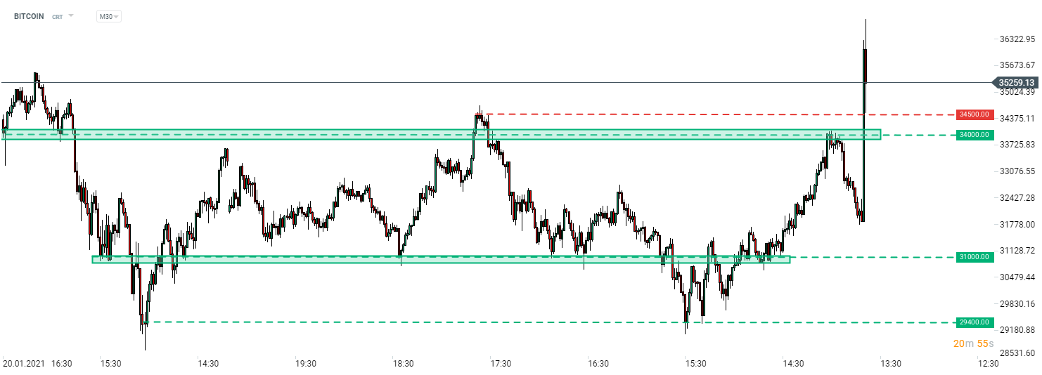 Il bitcoin ha subito un'impennata enorme ed è passato da circa $ 31.850 a oltre $ 37.000 in 30 minuti. Fonte: xStation5