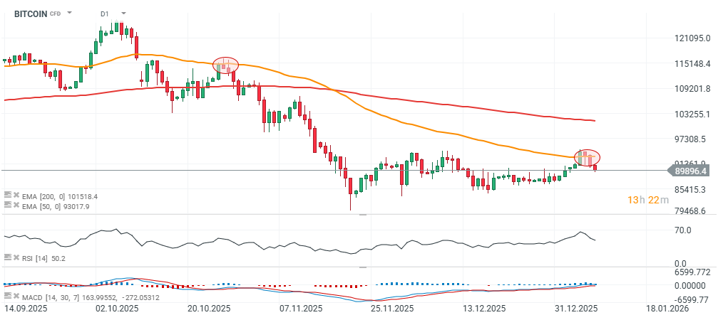 Un ulteriore calo potrebbe innescare un impulso ribassista verso i 80.000 USD. La zona di resistenza chiave resta i recenti massimi locali intorno a 93.000–95.000 USD, ulteriormente rafforzata dalla EMA50 (linea arancione).