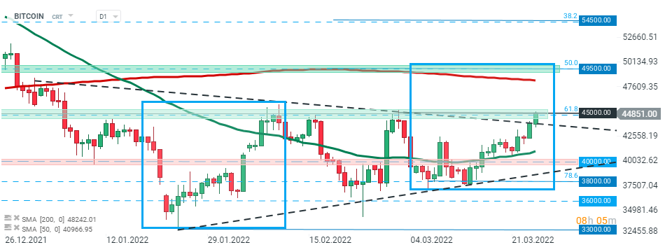 Se Bitcoin riesce a chiudere sul grafico giornaliero sopra i 45.500$, questo potrebbe segnalare un potenziale breakout dalla zona di consolidamento. In questo scenario la prossima resistenza principale da tenere d'occhio si trova intorno a $ 49500, che è contrassegnato dal limite superiore della struttura 1:1 e dal 50% del ritracciamento di Fibonacci dell'ondata al rialzo iniziata a luglio 2021. D'altra parte, se la situazione dovesse cambiare, potrebbe iniziare un altro impulso al ribasso verso il supporto psicologico a $ 40.000. Fonte: xStation5