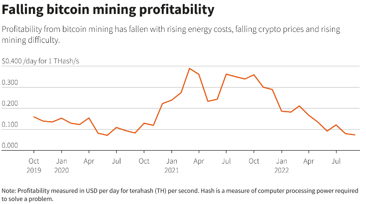 Il mining di bitcoin sta diventando sempre più non redditizio ed è attualmente ai livelli della primavera/estate 2020. Il calo dell'hash rate significa che la redditività viene erosa e pesa sui minatori di Bitcoin facendo perdere le azioni delle società di "mining" di Bitcoin RIOT Blockchain (RIOT.US), HIVE Blockchain (HIVE.US) o Marathon Digital (MARA.US) . Inoltre, i margini sono impattati dai prezzi record dell'elettricità, che potrebbero diventare un problema per tutti i progetti Proof of Work. Fonte: bitinfocharts.com, Reuters, Vineed Sachdev, Manas Scharma
