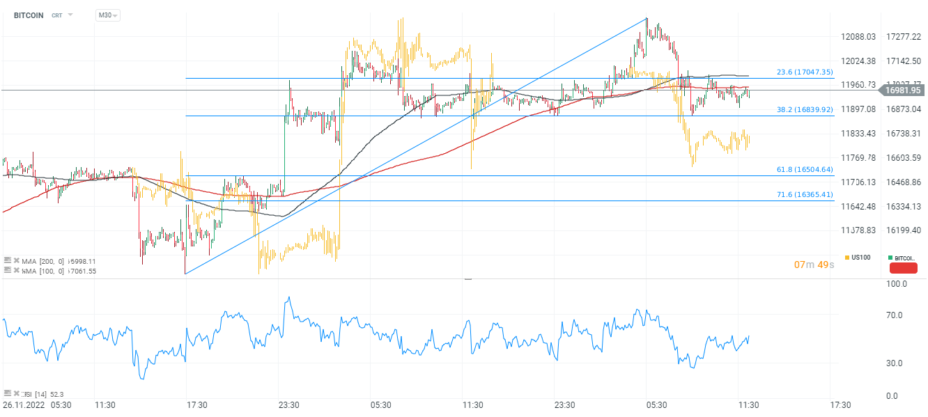 Grafico Bitcoin, M30. La principale criptovaluta è riuscita a difendere il livello di $ 17.000 nonostante il sell-off dinamico di ieri, durante il quale il sentimento ha impedito che raggiungesse il livello di $ 17.500. Vediamo anche che Bitcoin continua a essere correlato con l'indice NASDAQ (grafico giallo). Il calo di ieri sugli indici tradotti in sentimento nel settore delle criptovalute. Di conseguenza, Bitcoin è di nuovo superato la media di 200 sessioni (linea rossa) e il prossimo supporto più vicino si trova nella zona di $ 16.800, dove si trova il 38,2% del ritracciamento di Fibonacci dell'onda al rialzo iniziata a fine novembre. Fonte: Xstation5