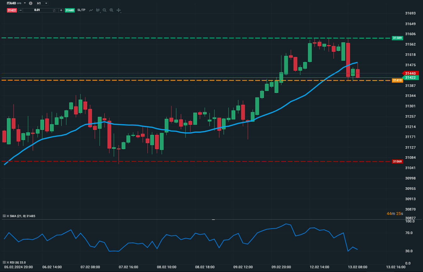 L'indice ITA40 sta affrontando una pressione al ribasso, registrando un calo di circa lo 0,5% all'inizio della sessione di trading. Questo calo è particolarmente evidente nel settore bancario, con istituti come Banca Mediolanum (BMED.IT), Banca Generali, Unipol (US.IT) e Unicredit (UCG.IT) tra i peggiori mentre anche aziende importanti come Stmicroelectronics (STM.IT) e Moncler (MONC.IT) stanno registrando cali, contribuendo al sentiment complessivamente negativo del mercato. Fonte: xStation5