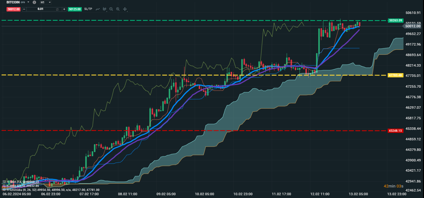 Bitcoin sta testando il livello di $50.000 dopo essere rimbalzato dal limite superiore della nuvola di Ichimoku sul grafico H1. Fonte: xStation5