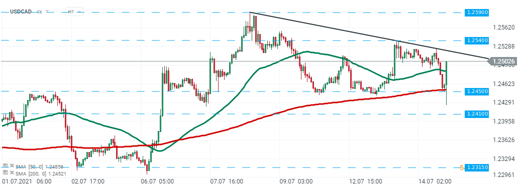 USDCAD - inizialmente la coppia di valute è scesa dopo la decisione della BoC, tuttavia la situazione è cambiata rapidamente e il prezzo si sta dirigendo verso la linea di tendenza al ribasso. Fonte: xStation5