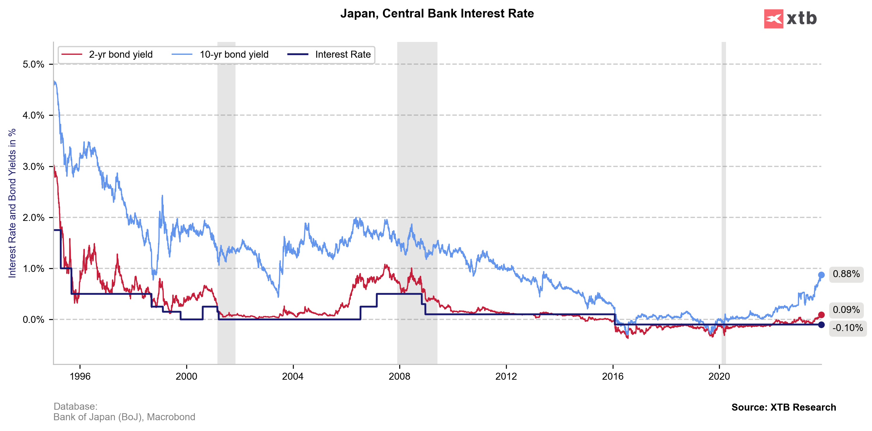 L'aumento dei rendimenti è visibile in tutto il mondo e il Giappone non fa eccezione. La Banca del Giappone ha mantenuto un obiettivo dello 0% sui rendimenti governativi a 10 anni con una banda di tolleranza di 50 punti base. Tuttavia, il continuo aumento dei rendimenti ha indotto la BoJ ad allentare la banda di tolleranza e a consentire deviazioni al rialzo fino a 100 punti base. Attualmente il rendimento a 10 anni è leggermente inferiore allo 0,90%. Mantenere una banda di tolleranza di questo tipo in un contesto di rendimenti in crescita è costoso e non si può escludere che venga ulteriormente allentata per consentire ai rendimenti a lungo termine di salire oltre l'1%.