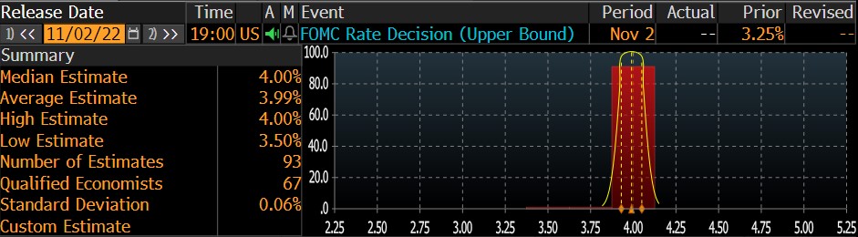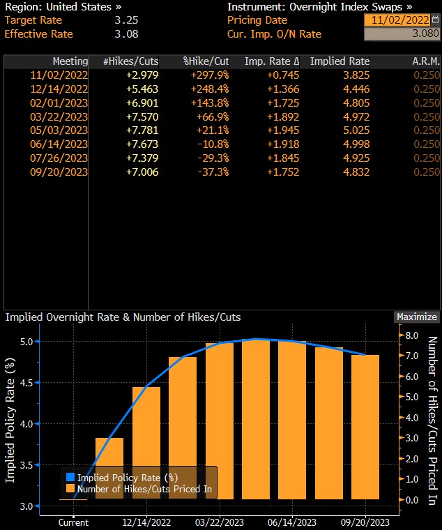 Un aumento nell'incontro di oggi è più che certo. Il mercato sta attualmente scontando un aumento di 75 punti base alla riunione di oggi del FOMC. Questo percorso sembra essere confermato anche dagli swap, che indicano una probabilità vicina al 100% di un aumento di 75 punti base. Cosa significa questo? Il mercato è pronto per un'azione decisiva della Fed, con poche possibilità di un'improvvisa inversione di tendenza.