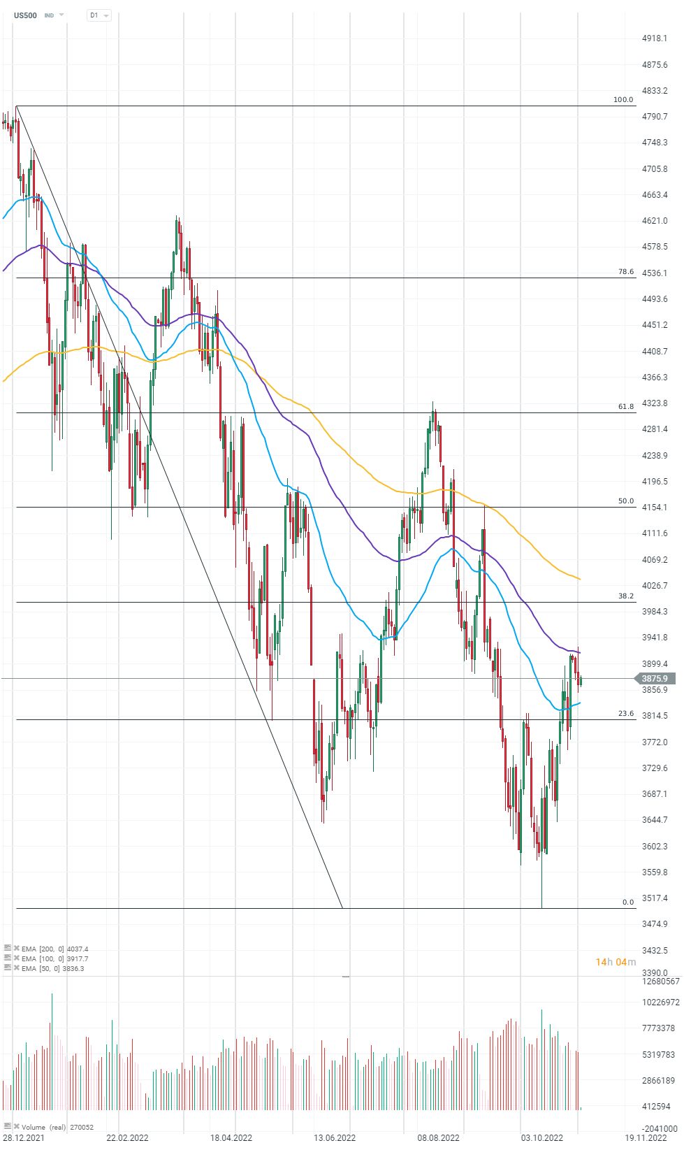 I futures sull'US500 stanno registrando guadagni moderati questa mattina e stanno cercando di recuperare le perdite di sessione di ieri. Stiamo assistendo a un leggero aumento dei rendimenti a 10 anni statunitensi, anche se per ora sono ancora troppo piccoli per indicare una tendenza definita. Naturalmente vale la pena ricordare che statisticamente US500 è salito nel mese in cui si sono svolte le elezioni di medio termine americane. D'altra parte, se la Fed rimane con la sua attuale strategia e non cambia la sua posizione su un'ulteriore riduzione del bilancio, potrebbe indicare che l'attuale rimbalzo è un'altra correzione nella tendenza al ribasso principale. Fonte: xStation 5