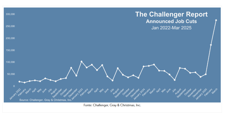 Dati non rassicuranti per l'economia Usa che ha visto nella scorsa settimana l'uscita dei dati del lavoro che inquadrano una situazione pessima. In primis il report Challenger che ha sottolineato come la politica Doge stia comportando numerosi tagli di posti di lavoro nel settore governativo, con i tagli che arrivano a toccare la cifra record dei 276.000. Il dato in questione é un vero e proprio record in quanto é il peggior marzo dal 1989, il terzo mese peggiore dal 1989 (anno di inizio rilevazione dati) e il primo trimestre peggiore dal Q1 del 2009, periodo di recessione profonda in Usa. A corredo di questo dato arriva l'ulteriore aumento delle richieste continue di sussidi di disoccupazione che ritornano a quota 1,9 milioni avvicinandosi ai massimi assoluti post-pandemici raggiunti a dicembre scorso. Il tasso di disoccupazione sale al 4,2% riportandosi sui massimi visti nel 2024 e di fatto, come abbiamo potuto vedere dai dati sui Nonfarm Payrolls, non sono stati presi ancora in considerazione i tagli di posti di lavoro che invece registra Challenger nel suo report, sia per questo mese che per quello scorso. In pratica ci possiamo tranquillamente aspettare un ulteriore forte peggioramento del tasso di disoccupazione nei prossimi mesi, il tutto sarebbe confermato dai dati in uscita sulle richieste di sussidi che hanno una frequenza settimanale, pertanto questo risulta ora il dato piú importante da monitorare da qui alla prossima riunione della Fed. A proposito di Fed, un peggioramento della disoccupazione porterebbe tranquillamente la Fed a rivedere la sua politica monetaria con possibili tagli dei tassi aggressivi.