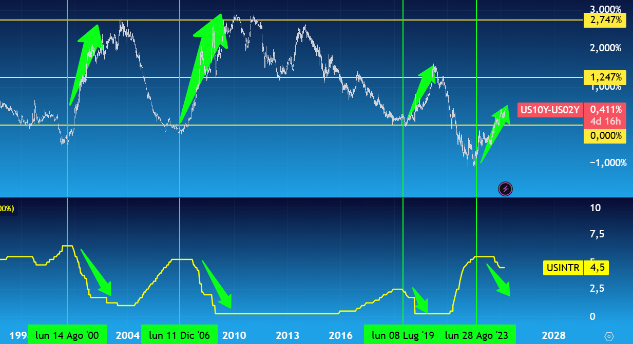 Nella parte superiore lo spread 2-10 anni USA mentre nella parte inferiore abbiamo i tassi Fed. Da notare come all'innalzamento dello spread coincide il taglio dei tassi - Fonte: TradingView.com - Studio: David Pascucci (XTB)