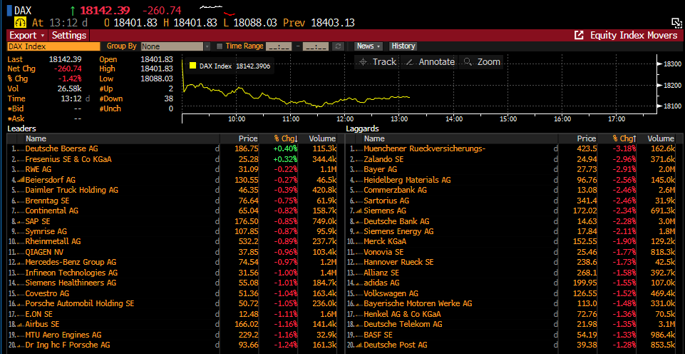 - I futures DAX (DE40) perdono lo 0,3%, la stragrande maggioranza dei titoli azionari registra cali