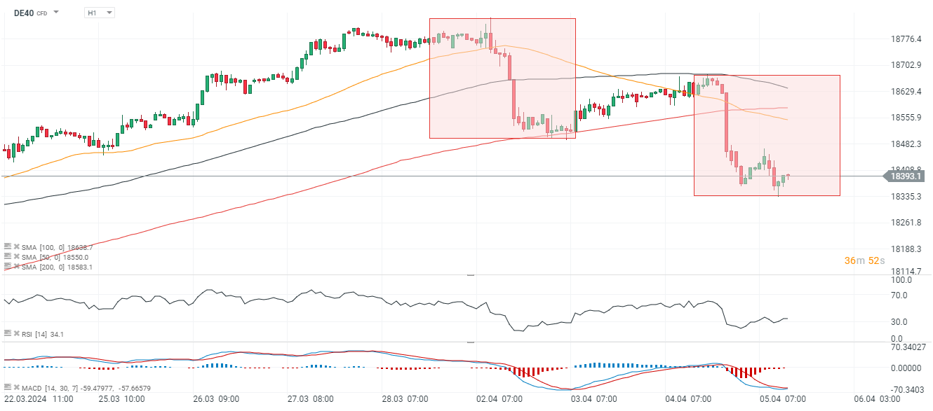 L'indice DE40 è scambiato leggermente in ribasso oggi, ma non è riuscito a riprendersi dalla svendita di ieri. Se lo scenario di una correzione 1:1 dovesse realizzarsi, non è escluso un test in prossimità di 18500 punti, dove potrebbe svolgersi una battaglia più intensa tra domanda e offerta.