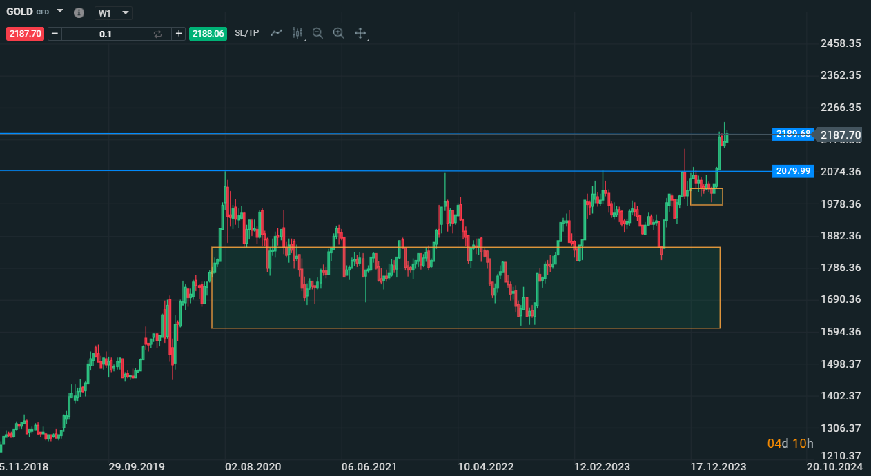 Gold grafico settimanale con area di lateralitá dal 2020 in poi - Fonte: XStation