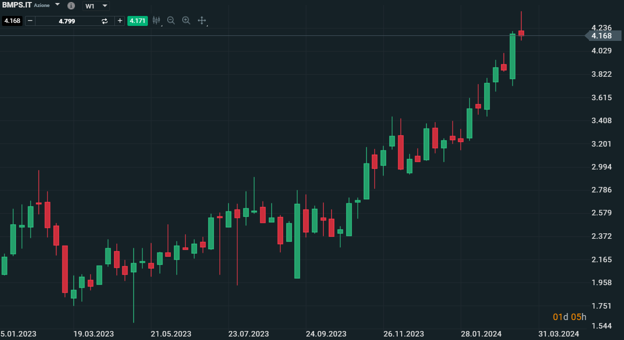 Il peggior titolo del Ftse Mib di oggi é Banca Mps che non solo registra un calo del -2,8%, bensí chiude male la settimana di negoziazione. Il trend di lungo rimane fortemente positivo ma la chiusura settimanale risulta tecnicamente debole e in chiusura negativa. Il titolo, come tutti i bancari del Ftse Mib, ha beneficiato dei tassi alti negli ultimi mesi registrando performance di circa il 90% da ottobre 2023. Attenzione quindi, non solo al Ftse Mib, anche ai titoli bancari come Banca Mps che al momento risulta avere una chiusura settimanale negativa con performance a doppia cifra conseguite in pochi mesi di negoziazione.