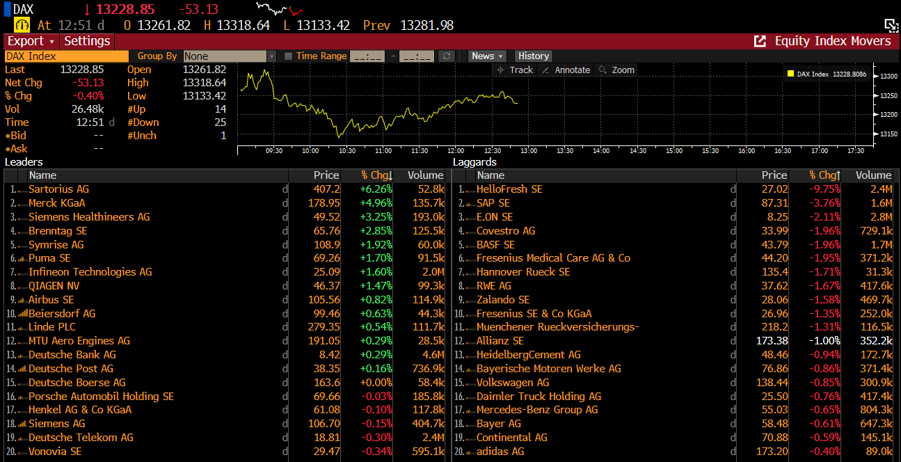 Le maggiori variazioni percentuali nelle società incluse nell'indice DAX. Fonte: Bloomberg