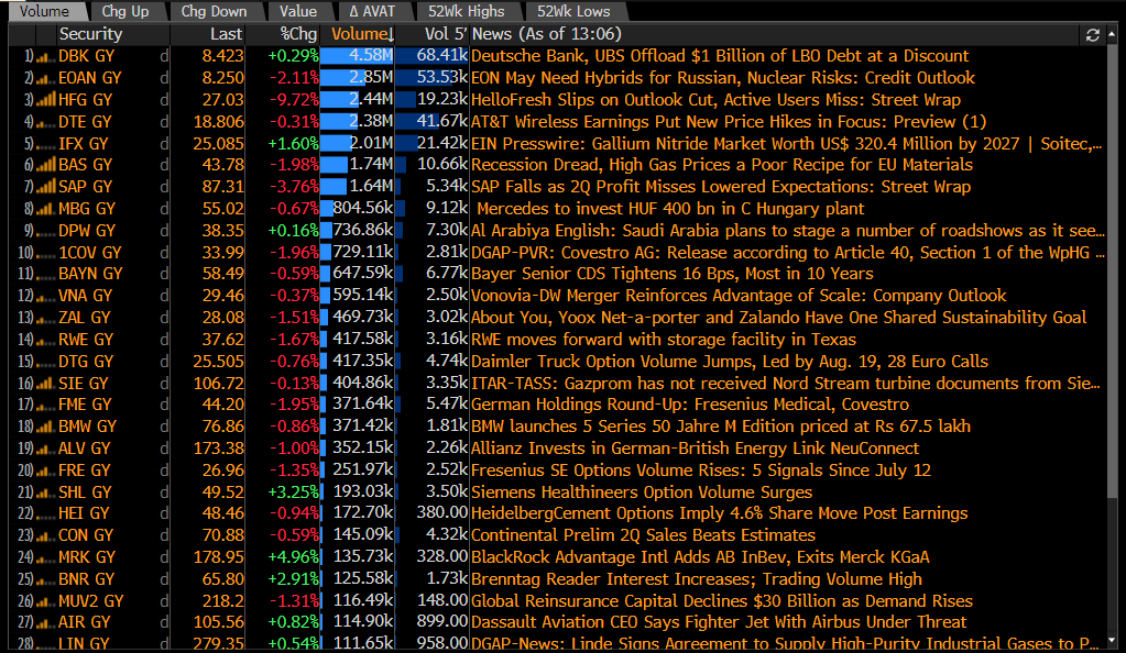 I titoli più attivi nell'indice DAX (DE30). Fonte: Bloomberg