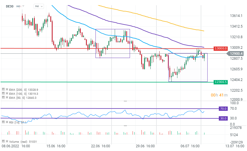 Il DE30 rimane vicino alla zona definita dalla media mobile esponenziale a 50 periodi (curva blu) e sta lottando per uscire dalla struttura 1:1 menzionata in precedenza. La zona di 12.755 punti può attualmente fungere da livello di supporto locale, mentre il livello psicologico di 13.000 punti può fungere da resistenza. Fonte: xStation 5