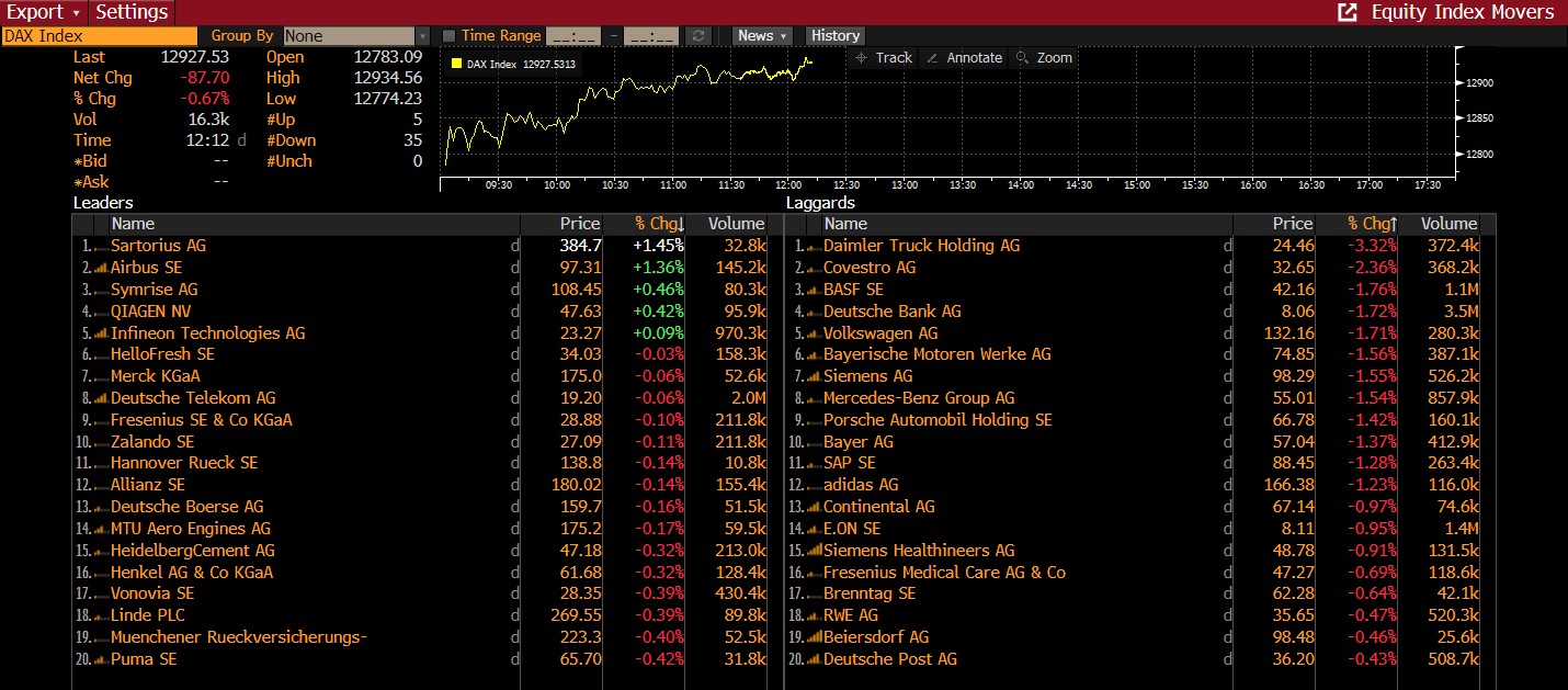 Società incluse nell'indice DAX (DE30) e le loro maggiori variazioni percentuali su base giornaliera. Fonte: Bloomberg