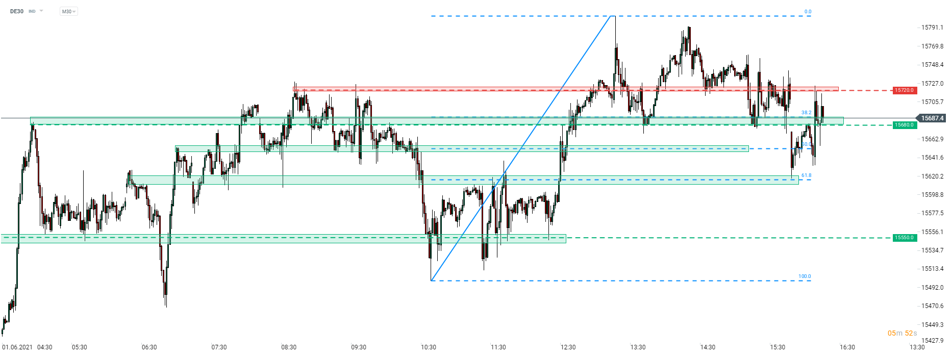 DE30 si è ritirato dopo la decisione del FOMC di ieri e ha testato il supporto al 61,8% del ritracciamento di un recente movimento al rialzo (area 15.615 punti). Da allora l'indice si è leggermente ripreso, ma la zona di resistenza a 15.720 ha agito come una mossa al rialzo limitata. I trader dovrebbero notare una chiara struttura di tendenza al ribasso sul grafico M30 con minimi e massimi decrescenti. Per invalidare questa struttura, DE30 dovrebbe superare il livello di 15.740 punti. Al momento della stampa è in fase di test una zona di supporto compresa tra 15.680 punti e un ritracciamento del (15.690 punti). Nel caso in cui continuasse il ribasso, l'indice potrebbe scendere e testare nuovamente i minimi recenti nella suddetta area di 15.615 punti. Superare questo ostacolo potrebbe essere visto come un segnale di avvertimento di una mossa verso il basso più grande.