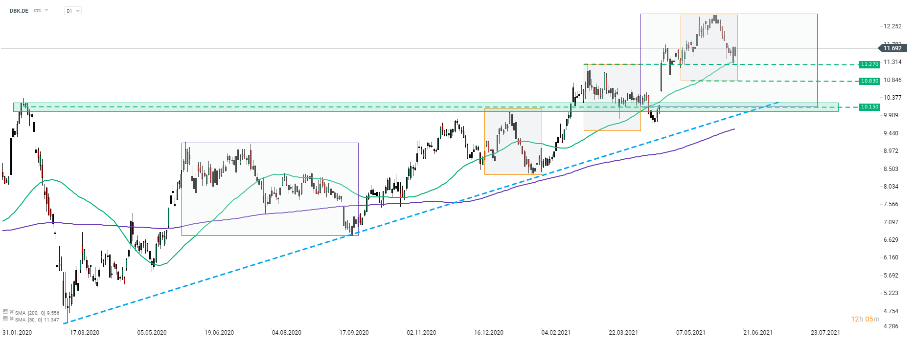 Deutsche Bank (DBK.DE) è in rialzo di oltre il 3% oggi, a seguito di un messaggio aggressivo del FOMC di ieri. Il titolo è rimbalzato dall'area di supporto di € 11,27, contrassegnata dalle precedenti reazioni di prezzo e dalla media mobile a 50 sessioni (linea verde). Poiché il prezzo delle azioni rimane al di sopra del limite inferiore della geometria del mercato locale (10,83 €) e del limite inferiore della struttura di Overbalance di grandi dimensioni (10,15 €), la struttura del trend rialzista rimane intatta. Fonte: xStation5