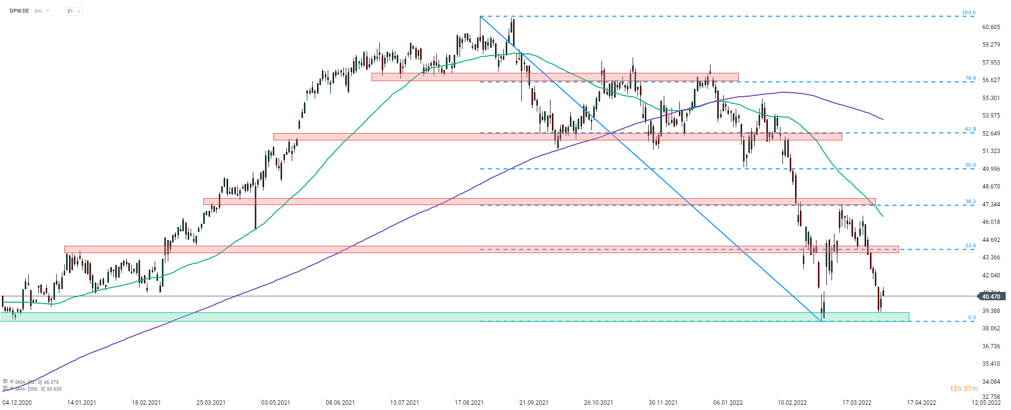 Deutsche Post (DPW.DE) è scesa al livello più basso da novembre 2020 in seguito al lancio dell'invasione russa dell'Ucraina. Le azioni sono riuscite a riprendersi, ma in seguito è arrivata un'altra ondata di vendite. Di conseguenza è apparso un doppio minimo nell'area di € 39,00. Se venisse superata la scollatura del pattern nell'area di 47,20€, le azioni di Deutsche Post potrebbero essere destinate a un movimento al rialzo più ampio. Fonte: xStation5