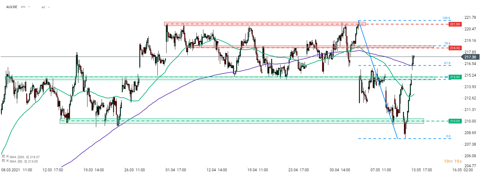 Allianz (ALV.DE) ha iniziato la sessione di oggi con un gap di prezzo rialzista poiché i mercati azionari hanno continuato a riprendersi dalle vendite di questa settimana. Il titolo ha superato di nuovo la media mobile di 200 ore per la prima volta dal 5 maggio 2021 e ha continuato a salire dopo il lancio della sessione. La zona di resistenza a breve termine per Allianz può essere trovata compresa tra € 218,30 e il 78,6% del ritracciamento del calo iniziato il 5 maggio. Fonte: xStation5