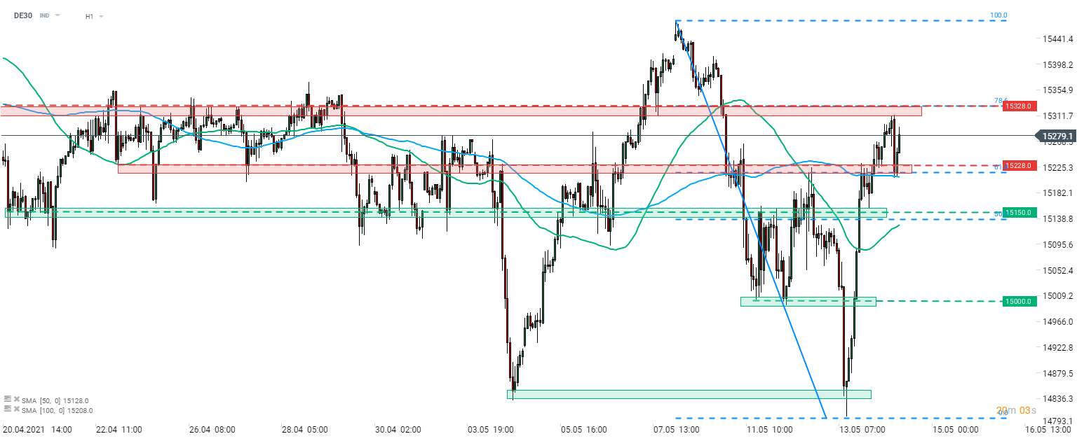 Ieri DE30 ha avuto una grande inversione di tendenza. L'indice è sceso di quasi il 2% a un certo punto della sessione di ieri, ma è riuscito a recuperare le perdite e finire la giornata in rialzo dell'1%. DE30 è salito durante la sessione asiatica e ha testato la zona di resistenza sotto il 78,6% del ritracciamento (15.328 punti). Tuttavia, l'indice non è riuscito a superarlo e si è ritirato dopo l'inizio della sessione. Il pullback è stato interrotto nella zona dei prezzi contrassegnata con il 61,8% del ritracciamento e una media mobile a 100 ore (linea blu). Due livelli chiave a breve termine da tenere d'occhio sono contrassegnati dai suddetti ritracciamenti: 61,8% (supporto) e 78,6% (resistenza). I dati sulle vendite al dettaglio negli Stati Uniti alle 14:30 potrebbe innescare un aumento della volatilità, quindi i trader dovrebbero stare in guardia.