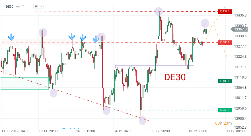Dopo un'altra sessione record negli Stati Uniti, il DE30 ha aperto in rialzo dopo Natale, ma ancora una volta abbiamo visto che i trader in Germania sono molto più cauti e ne conseguono profitti. Possiamo vedere che i tentativi precedenti di oltrepassare i 13300 punti non hanno avuto successo e hanno portato a profitti più piccoli o più grandi, ma nell'ultima occasione in cui il breakout ha preso la forma di un gap rialzista (come oggi) abbiamo almeno avuto un altro tentativo prima di un take profit maggiore.