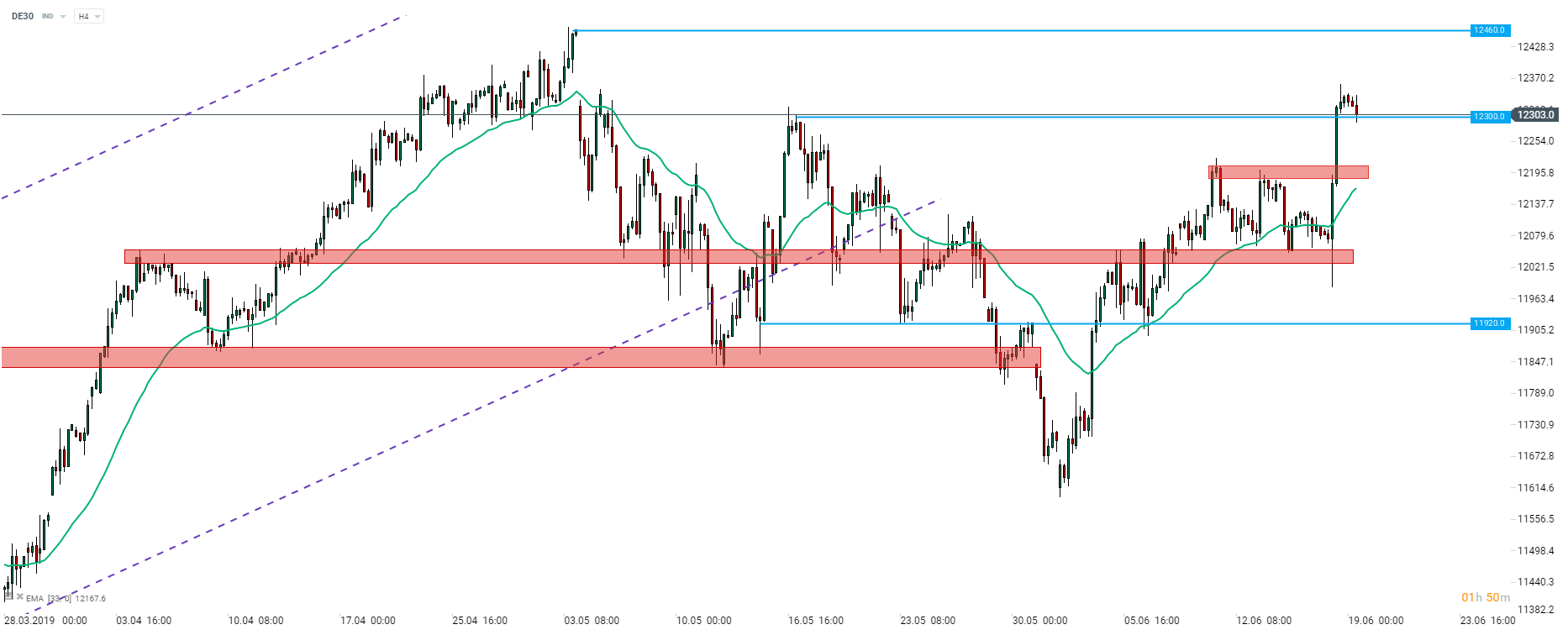 I commenti di ieri di Mario Draghi scatenano uno straordinario rally sui mercati azionari europei, incluso DAX (DE30). Il benchmark tedesco ha raggiunto il livello più alto dall'inizio di maggio. Il pullback che si sta verificando mercoledì mattina non dovrebbe essere troppo preoccupante dato il ritmo dei guadagni di ieri. Nel caso in cui il DE30 riesca a chiudere il giorno al di sopra dell'impugnatura di 12300 pts, non si può escludere la possibilità di testare il massio a YTD (area di 12460 punti). Fonte: xStation5