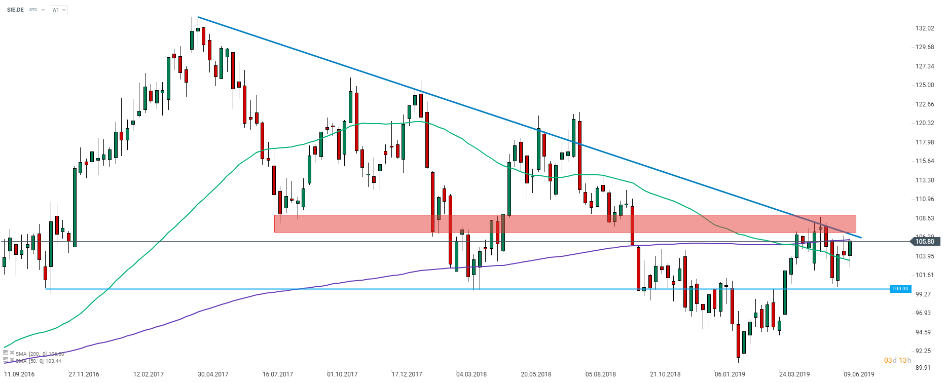 Siemens (SIE.DE) è stata scambiata in una tendenza al ribasso per oltre due anni. Lo stock è riuscito a spingere più in alto di recente, ma si è imbattuto nell'area che potrebbe vedere più attività dei ribassisti. Vale a dire, lo stock sta testando una media mobile di 200 settimane (linea viola) che sta girando appena sotto la linea di tendenza al ribasso. Il mancato superamento di questi ostacoli potrebbe innescare una mossa al ribasso che potrebbe portare il prezzo a un minimo di 100 € di handle. Fonte: xStation5