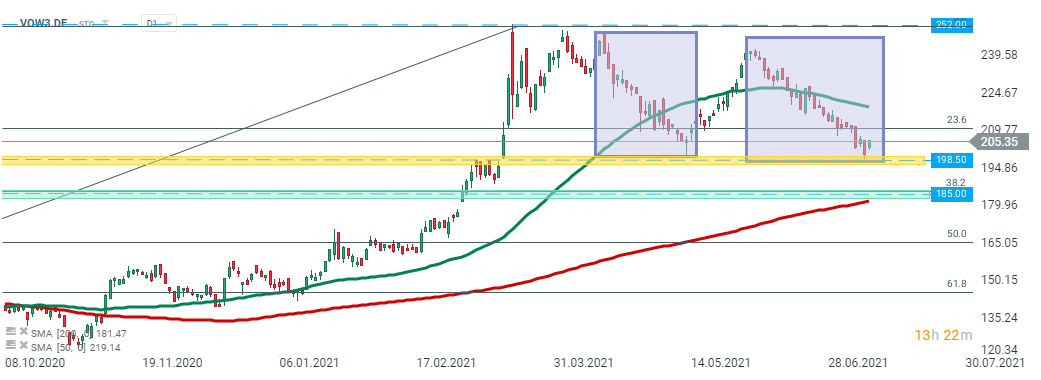 Il titolo Volkswagen AG (VOW3.DE) è sceso drasticamente durante la sessione di ieri, tuttavia non è riuscito a superare il supporto principale a € 198,50, che coincide con il limite inferiore della struttura 1:1. Il titolo ha iniziato la sessione di oggi in rialzo e si sta dirigendo verso la resistenza locale a € 219,00, rafforzata da 50 SMA (linea verde). D'altra parte, se venisse superato il suddetto supporto a € 198,50, il prossimo supporto importante potrebbe trovarsi a € 185,00. Fonte: xStation5