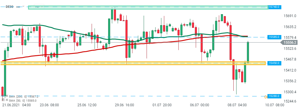 Il DE30 ha registrato forti movimenti al ribasso durante la sessione di ieri, tuttavia non è riuscito a superare il supporto a 15280 punti e gli acquirenti hanno ripreso il controllo. Nelle prime ore di trading l'indice ha superato il limite inferiore del range di consolidamento nell'area di 15.450 punti e si sta dirigendo verso la resistenza locale a 15580 punti che coincide con 50 SMA (linea verde) e 200 SMA (linea rossa). Se venisse superato, il movimento potrebbe accelerare verso il limite superiore del range a 15740 punti. Fonte: xStation5.