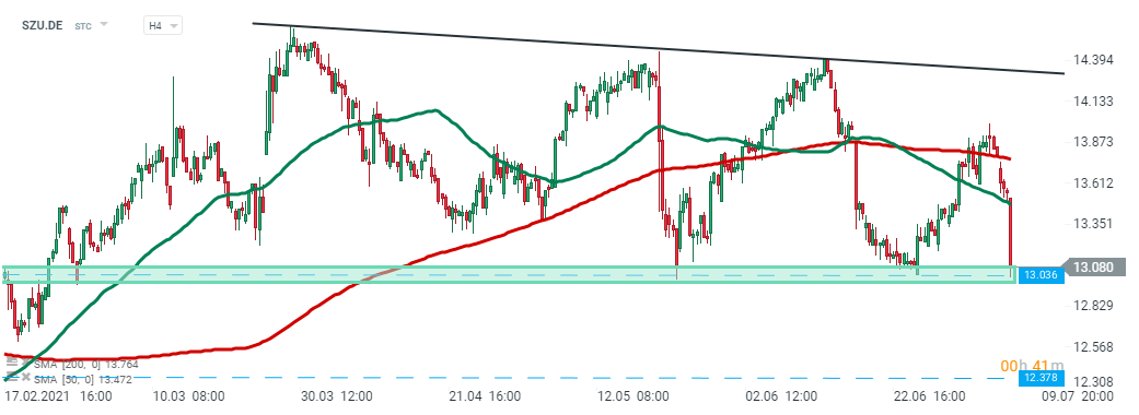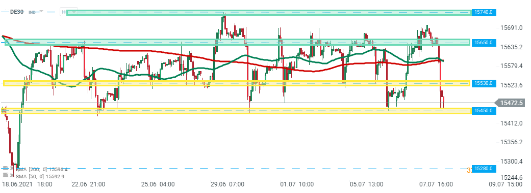 DE30 si è ritirato poco dopo l'inizio della sessione odierna e sta testando il limite inferiore del range nell'area di 15.450 punti. Se venisse superato, il calo potrebbe accelerare verso il supporto successivo a 15280 punti. D'altra parte, se venisse fermato qui, potrebbe inizare un altro movimento al rialzo verso 15.650 punti. Fonte: xStation5.
