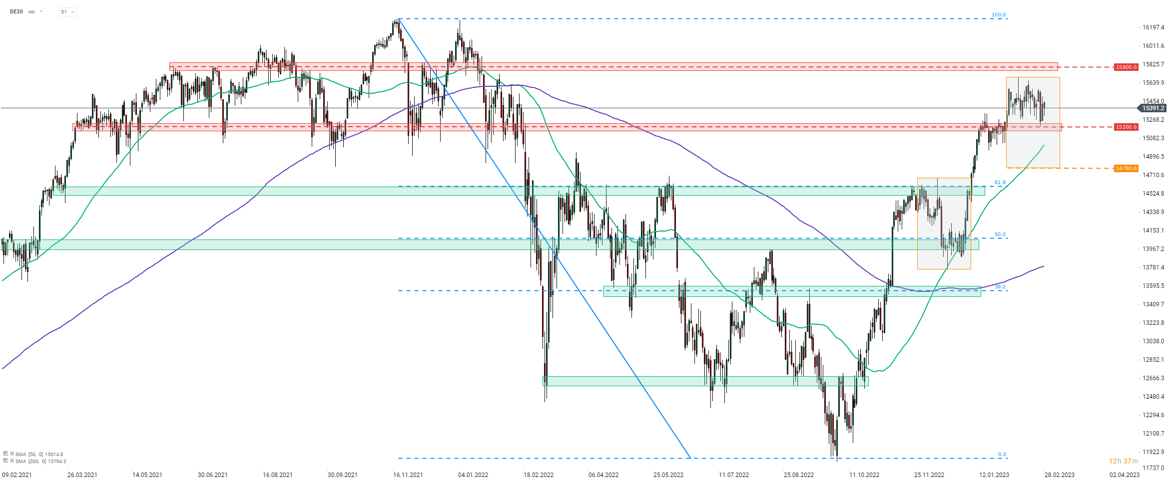 Il DAX tedesco (DE30) ha subito un duro colpo alla fine della settimana scorsa ed è tornato alla zona di supporto di 15.200 punti. Tuttavia, la situazione è cambiata all'inizio di questa settimana con gli indici europei che registrano solidi guadagni lunedì. Il DE30 è riuscito a difendere la suddetta area di 15.200 punti e recuperare la maggior parte delle perdite di venerdì. Tuttavia, un movimen to sotto i 15.200 punti non renderebbe immediatamente la prospettiva ribassista. Da un punto di vista tecnico, per un'inversione di tendenza sarebbe necessaria un superamento dell'area dei 14.780 punti, che segna il limite inferiore della struttura dell'Overbalance.