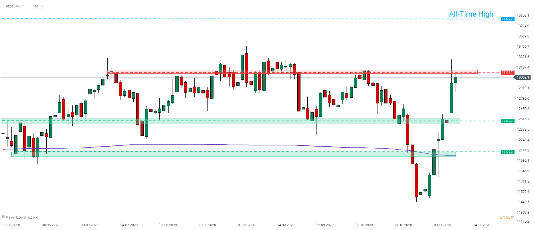 DE30 ha avuto un grande rally dopo l'annuncio del vaccino contro il coronavirus di Pfizer / BioNTech. Tuttavia, l'indice tedesco è salito verso i 13.300 punti ma non è riuscito a mantenere questi guadagni e si è ritirato al di sotto della zona di resistenza a 13.125 punti che è segnata dalla linea delle spalle del precedente modello testa e spalle. L'indice ha testato questo ostacolo questa mattina, ma non è riuscito a superarlo. Il panorama tecnico supporta un pullback con 12.500 punti che sono il primo grande supporto da tenere d'occhio. Fonte: xStation5