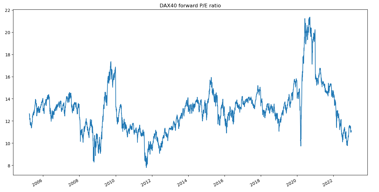 Il forward PE ratio per DE30 rimane al di sotto della media pluriennale. Fonte: Bloomberg, Ricerca XTB