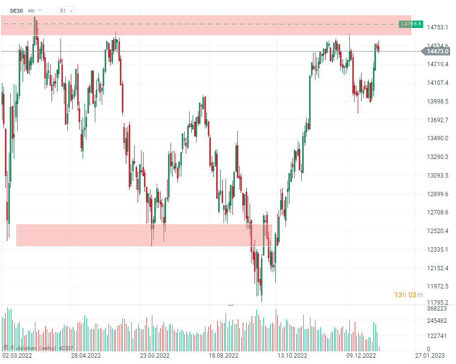 Il DE30 rimane in una posizione difficile. Mentre la maggior parte dei dati macro appare brutta, le valutazioni sembrano essere basse, almeno in superficie. Il rapporto P/E a termine è appena a 11,5, visibilmente inferiore alla media decennale di 13,8. Questo è il risultato dei guadagni record che le aziende tedesche hanno potuto registrare dopo la pandemia. Ad un certo punto nel 2022 i mercati hanno temuto che la crisi energetica avrebbe colpito gli utili futuri, ma con i prezzi dell'energia in forte calo in Europa queste preoccupazioni sono state ridotte. Inoltre, i dati PMI per novembre e dicembre sono migliorati, incoraggiando l'ottimismo. D'altra parte, la stretta della BCE deve ancora avere un impatto sull'economia e con gli ordini già in difficoltà, le aziende possono mantenere un'elevata redditività?