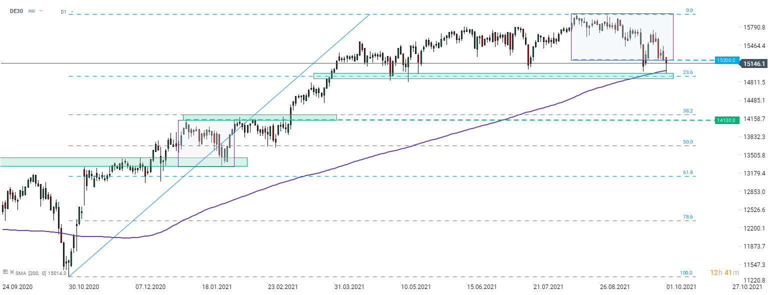 DE30 deve ancora fare un movimento decisivo al di sotto del limite inferiore della struttura Overbalance a 15.200 punti. L'indice ha superato questo ostacolo oggi, ma il movimento al ribasso è stato successivamente interrotto alla media mobile di 200 sessioni (linea viola, area 15.000 punti). Questo è stato il primo test di questa media mobile in quasi un anno ed è stata difesa l'area. La successiva ripresa ha permesso all'indice di recuperare gran parte delle perdite odierne. Il livello chiave da tenere d'occhio oggi sono i suddetti 15.200 punti. Superarlo potrebbe indicare una potenziale ripresa. D'altra parte, tornare verso i 15.000 punti e terminare la giornata potrebbe influenzare gli umori la prossima settimana. La suddetta media mobile sembra essere un supporto chiave per il trend rialzista.