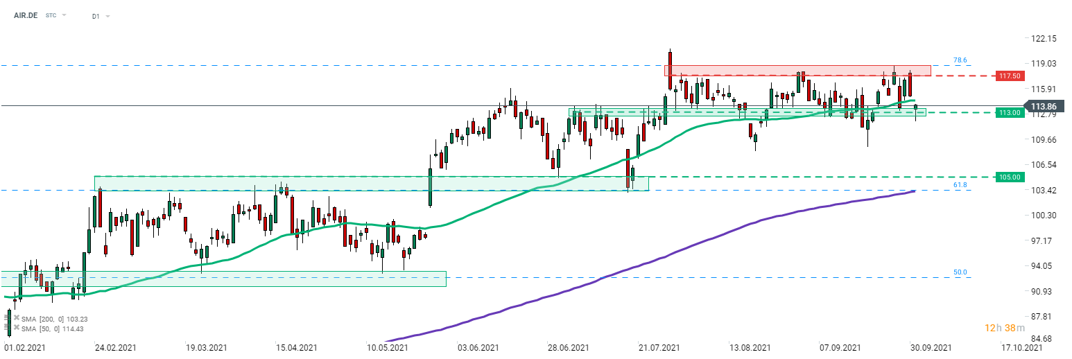 Nonostante l'annuncio di un accordo con l'italiana ITA, le azioni di Airbus (AIR.DE) sono oggi in ribasso. Il titolo del produttore di aerei europeo ha iniziato la sessione di trading di oggi in ribasso ma è riuscito a riprendersi dai minimi giornalieri. Di conseguenza, è apparso un modello di pin bar vicino al limite inferiore del recente trading range, uno sviluppo che potrebbe suggerire un'imminente mossa al rialzo. Fonte: xStation5