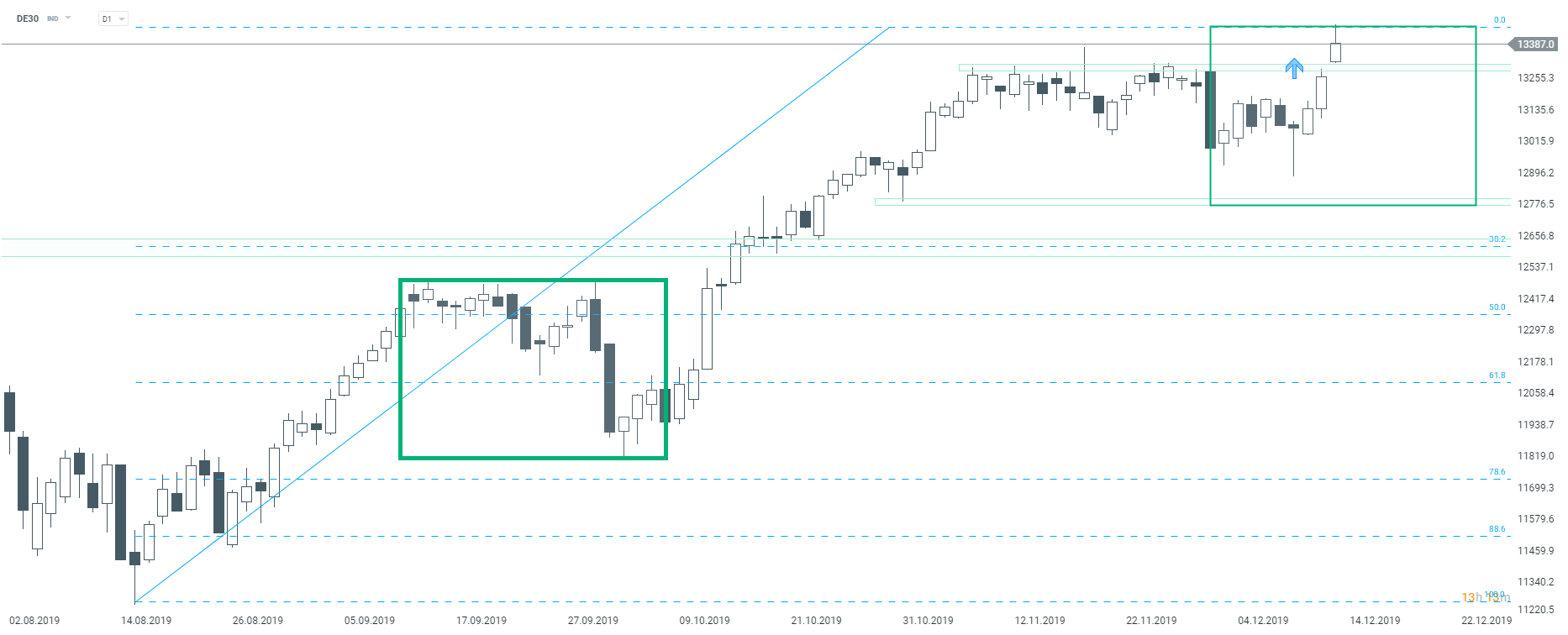 DE30 è balzato sopra la resistenza chiave a 13300 punti all'apertura del trading odierno. L'indice tedesco si è mosso fino a 13458 punti prima di retrocedere - il livello più alto da fine gennaio 2018. La resistenza più vicina e unica si trova nell'area 13530-13560 punti, dove si possono trovare i massimi storici. Molta incertezza è stata accantonata ieri poiché i conservatori hanno ottenuto la maggioranza in Parlamento e le tariffe di dicembre sono state rinviate, l'ottimismo potrebbe rimanere sui mercati per la restante parte dell'anno. Tuttavia, se dovessero arrivare cattive notizie, ci sono alcuni livelli di supporto da guardare sul grafico DE30. Il primo è nella suddetta zona di 13300 punti. Il limite inferiore del recente consolidamento (13160-13180 punti) dovrebbe fungere da supporto successivo. Il supporto chiave - limite inferiore della geometria del mercato locale - può essere trovato a circa 12800 punti.