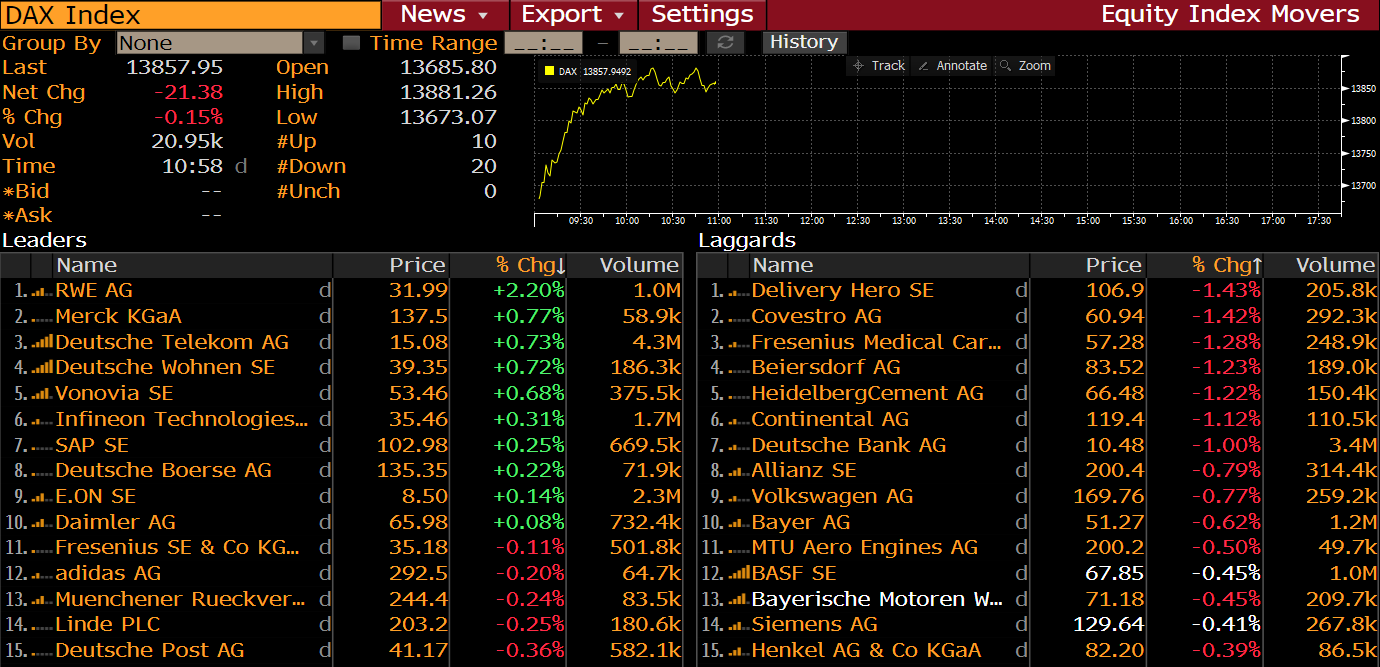 Membri DAX alle 9:58 GMT. Fonte: Bloomberg