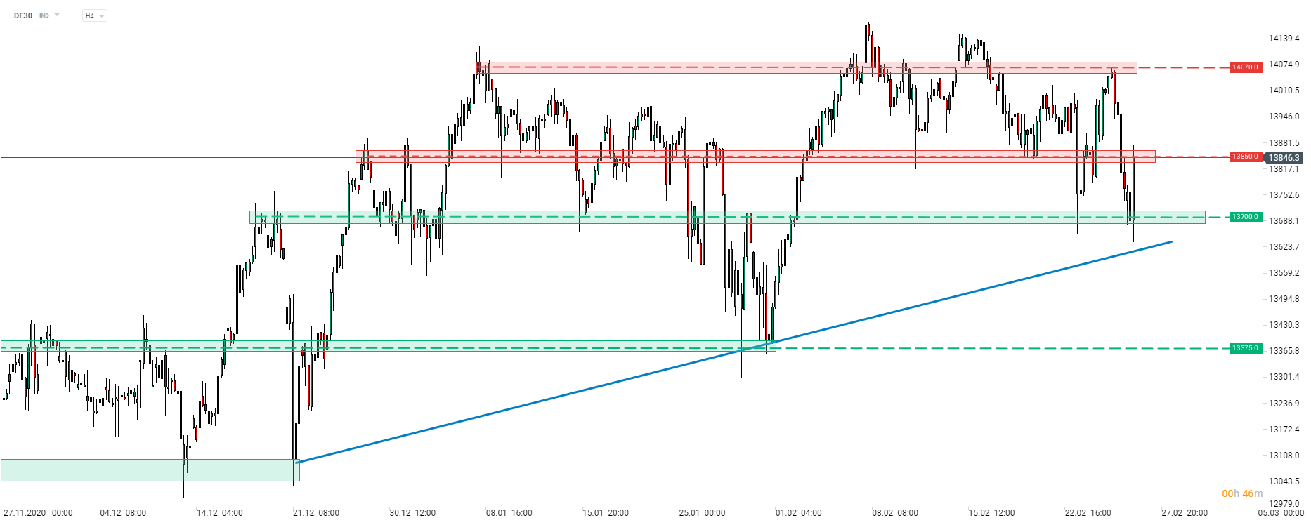 DE30 è sceso durante la notte e ha ritestato la zona di supporto a 13.700 punti. L'indice è riuscito a riprendersi da lì ed è salito verso l'area di oscillazione a breve termine a 13.850 punti. Superare questa resistenza spianerebbe la strada verso quella successiva a 14.070 punti. Dando uno sguardo alle prospettive più ampie, l'indice ha raggiunto un minimo più alto nella tendenza rialzista e potrebbe continuare il movimento al rialzo verso i massimi recenti. D'altra parte, nel caso in cui la ripresa fallisse e l'indice si ritirasse sotto la zona a 13.700 punti e la linea di tendenza al rialzo, le prospettive a breve termine si sposterebbero al ribasso e DE30 potrebbe puntare a un'area di 13.375 punti.
