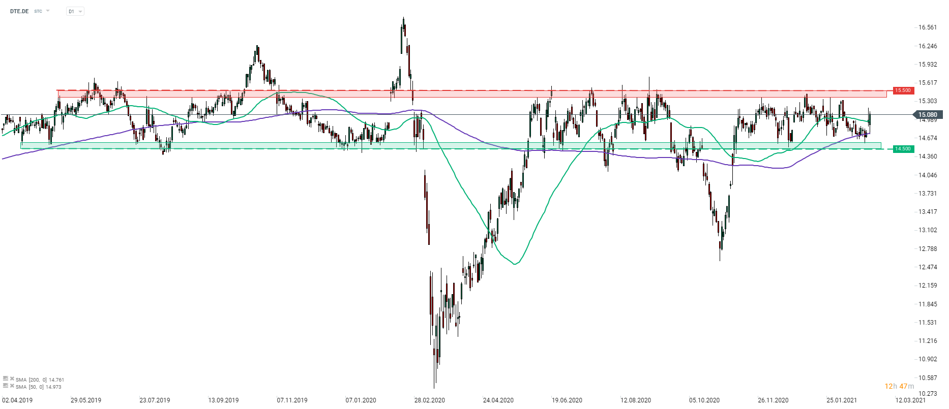 Deutsche Telekom (DTE.DE) è in rialzo dopo il rapporto sugli utili. Il titolo è sceso in precedenza durante la sessione, ma ha trovato supporto alla media mobile a 200 sessioni (linea viola). Il prezzo delle azioni può ora puntare verso il limite superiore di un rangea lungo termine a 15,50 €. Fonte: xStation5