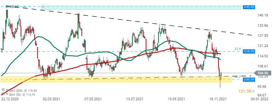 Il titolo Delivery Hero (DHER.DE) è sceso bruscamente durante la sessione di ieri, tuttavia non è riuscito a mantenere lo slancio e il prezzo è tornato sopra il supporto principale a € 100,50, che coincide con il limite inferiore della formazione del triangolo e il 38,6% del ritracciamento di Fibonacci dell'onda al rialzo iniziata di nuovo a Dicembre 2021. Se prevale il sentimento attuale, il prossimo livello da tenere d'occhio si trova al livello di € 118,00, rafforzato da 200 SMA (linea rossa) e dal 23,6% del ritracciamento di Fibonacci. Fonte: xStation5