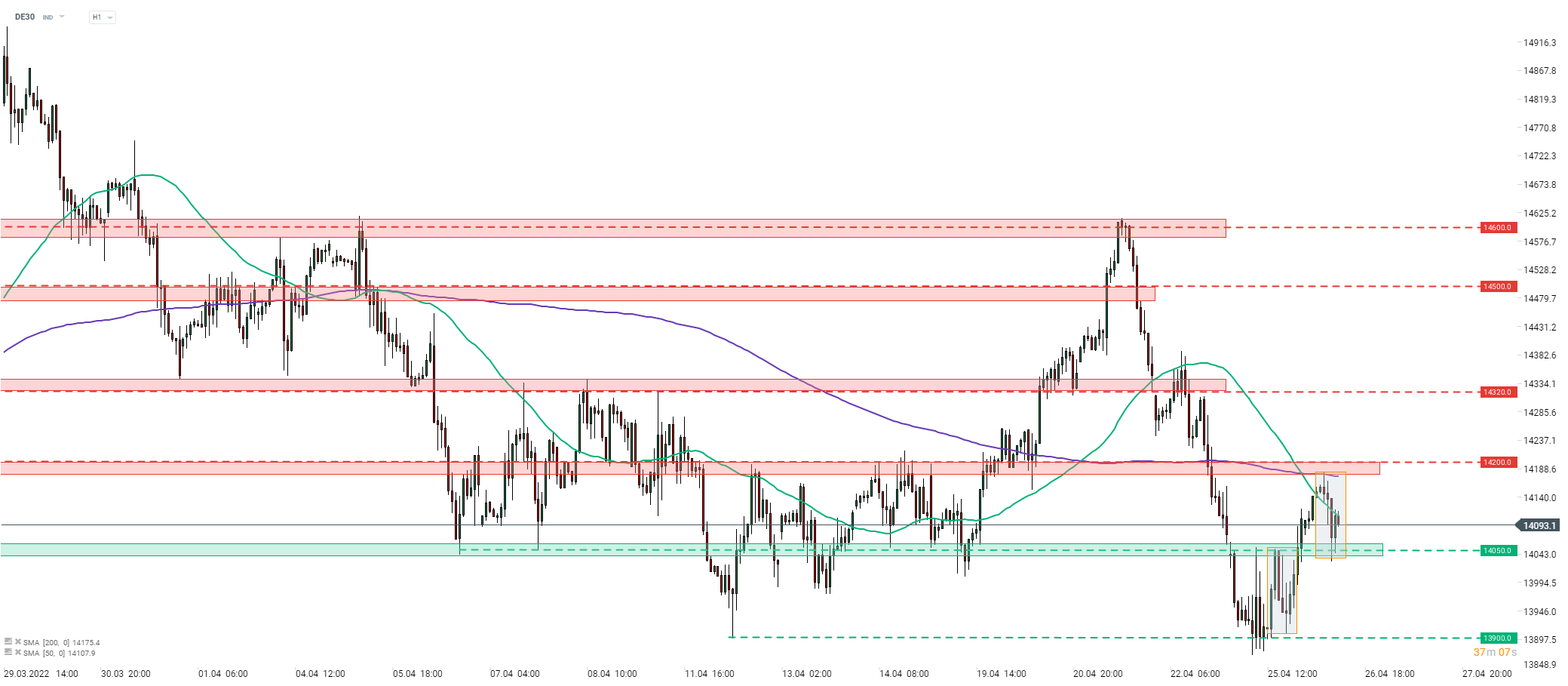 DE30 si è ritirato insieme ad altri mercati europei. Tuttavia, il calo si è fermato nell'area dei 13.900 punti e l'indice ha iniziato a riprendersi ieri in serata. L'indice è riuscito a tornare sopra il livello psicologico di 14.000 punti e il movimento al rialzo è continuato fino a quando non ha raggiunto una zona di resistenza compresa tra la media mobile a 200 ore (linea viola) e il livello di 14.200 punti. Un breve pullback si è verificato questa mattina, ma è stato interrotto nell'area di 14.050 punti. Da notare che questa zona è contrassegnata non solo da precedenti reazioni, ma anche dal limite inferiore di una geometria di mercato locale. Una reazione positiva a questo ostacolo segnala che la ripresa del movimento al rialzo rimane possibile con la suddetta zona di 14.200 punti che è la prima resistenza da tenere d'occhio.