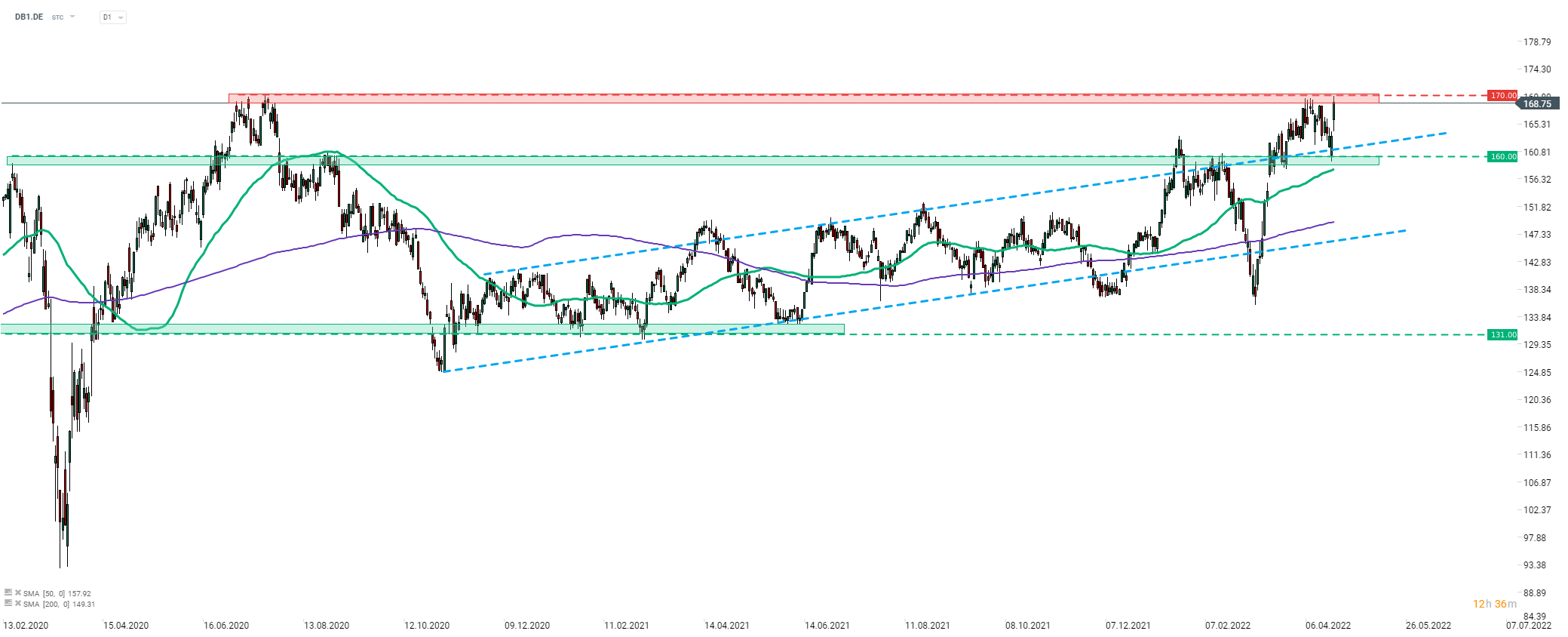 Deutsche Boerse (DB1.DE) è in rialzo dopo il rilascio degli utili del primo trimestre 2022 e l'aggiornamento delle previsioni. Il titolo ha testato oggi la zona di resistenza di 170€, segnata da massimi post-pandemia, ma non è riuscita a superarla. Tuttavia, la zona rimane vicina e non si può escludere un altro tentativo. Il supporto più vicino in caso di pullback si trova in area 160€, leggermente al di sotto del limite superiore del canale rialzista. Fonte: xStation5