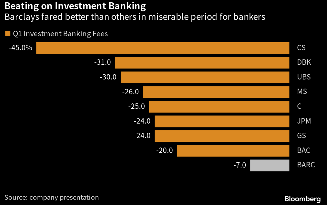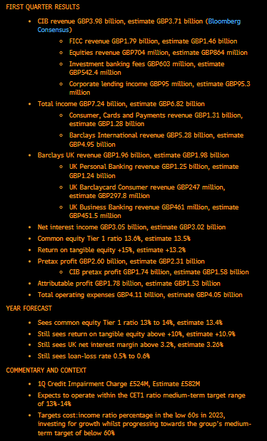 L'utile ante imposte ha superato le stime degli analisti (del 13%); e le unità di investment banking e corporate banking hanno ottenuto quasi il secondo miglior risultato nella storia della banca. L'istituto ha anche visto un afflusso di quasi 10 miliardi di sterline in nuovi depositi, un risultato diretto del calo di fiducia derivante da problemi sistemici nel settore bancario. Anche gli accantonamenti per perdite su prestiti sono aumentati, sebbene la banca affermi che l'ambiente dei prestiti si sta normalizzando.